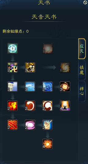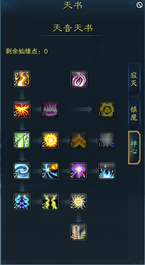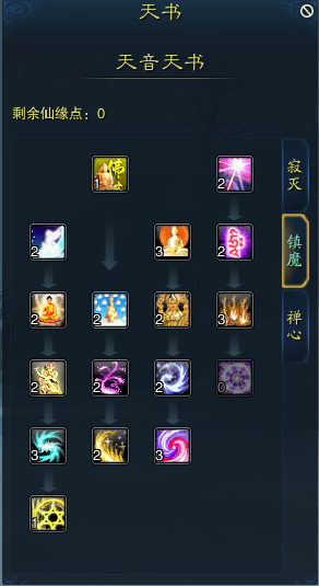 右边一排: 此一排不同之处较少,**点满佛魔真诀,因为此天书经幻心千劫版本修改后,对怪物提升的伤害十分可观 最后一个邪魔退散,是增加单攻技能有概率破防,但现今天舞宝轮的已经拥有100%的概率破防,可以选择舍弃这个概率破防的天书省下天书点 天书:禅心 此阶段变化不大,可以照着加点 当天书点多的时候,可以考虑分配给第二排第一个了世尘缘,减少群免死慈航普度的冷却时间,但这个天书不建议点,因为就算加上护符减少冷却的时候,也还是有300秒的冷却,在性价比上不是很多 左边第一个庇佑箴言,实际增加的是金刚护体1、金刚护体2的效果持续时间,如果有多的天书点,可以考虑分配上 以上是我个人对天音加点和天书的分享,对于不同阵营的天音在技能点的分配上会有所不同,但大体是一致的,技能点要随着版本变化而变化,我个人觉得性价比才是技能加点的精髓,有舍弃有着重,才比较好,希望可以给天音小伙伴一点建议吧