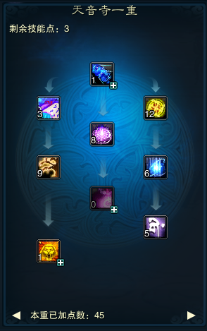 一重技能: 在这里先要说明的是,天音的1-4重每个右边第一个技能都要点满,有大悲咒、宏愿、佛光普照、净土真言,这4个技能会受到天书天鼓雷音的影响,对气血提升有很大作用