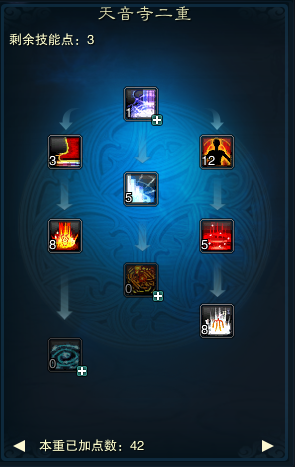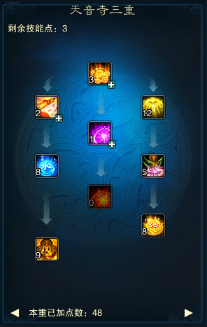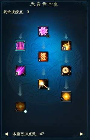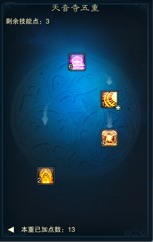 三重: 伏魔经:点3点,为了触发中间观音经的点的要求,此技能在幻心千劫版本后冷却为0秒,在打怪爬塔的时候可以使用,效果不错 地藏心经:此技能点2点即可,在幻心千劫版本后,此技能效果被改为恢复召唤物气血,原来的效果没有了,目前版本实际作用不大 四大皆空:水:点满 天地同寿:点满,此技能建议点满,因为星宿4代技能需要点满才能装,如果不是爆医,可以后期调整点数,佛阵营需要点满才能点造化的天地同寿2 观音经:点1点即可,用来**大凡般若的冷却 同归极乐:此技能仙天音点满,佛魔天音可以舍弃不点 佛光普照:点满 金刚护体:点满 四大皆空:地:点满 四重: 拈花妙谛:此技能点1点,后期若技能点多,可以分配至点满,此技能配合天书神魔妄念,在PK中可以持续降低目标技能命中,如果是PK型天音可以考虑点满此技能,副本天音可以点1点,不用点满 破魔秘言:点满,图中是4代技能,点满才可以装赤乌星辰 寂天蔽日:此技能**点满,因为是诅咒技能,无视技能躲闪,并且对怪物人物都有效,降低致命一击伤害与暴击率,装配护符并配合天书袈裟避天后,成功概率可以达到100%,在对人物方面,受天书袈裟避天影响,可以额外降低目标昏睡抗性 佛陀净世愿:不点,目前版本效果不大 魔诃心经:点满,佛阵营及其他阵营也要点满,因为星宿四代的加成可以使魔诃心经给予短时间血上的加成 六道轮回:此技能点1点即可,不用点9点,因为有了轩辕策的三代技能后,本1代技能就被覆盖,且三代的六道轮回不受天书影响,所以这个点1点就够了,可以省下8点技能点 净土真言:点满 因果循环:点满,此技能为自动复活,所以需要点满 慈航法愿:点满,此技能为法阵,增伤减伤,必须点满 五重: 雷音法谕:点满 大凡般若:点1点即可,因为有了轩辕策的三代大凡后,1代大凡就被替换,可以省下4点技能点 万象生佛:点满 无量真言:点满